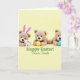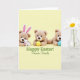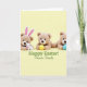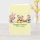 This card shows three soft, brown plush figures lined up along the lower third of a pale yellow background, creating a calm springtime scene 🌷. The figure on the left has tall ears with pink inner details, and it leans in as if cuddling a tiny white animal-shaped figurine close to its chest, like a quiet show of friendship. Beside it, the middle plush holds a smooth egg-shaped decoration in sunny yellow, angled slightly toward the others as if sharing the find. The right plush cradles a pastel blue egg, tucked in gently with a close, companionable posture that suggests they’re in on the same sweet moment 🐰. Soft, even lighting keeps the textures cozy, with the fuzzy fabric standing out against the matte finish of the small decorations. Centered below the trio, the words “Happy Easter!” appear in bold green lettering, and “Forever Friends” sits underneath in a thinner, flowing style in a darker shade. The eggs and figurine sit snugly against their plush paws, with the yellow egg in the middle and the blue egg on the right.