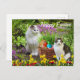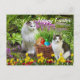 This postcard was created for everyone who loves cats or is a feral cat caretaker. The card features a white cat sitting in a flower garden and another cat, sitting next to an Easter Basket. The gray and white cat along with the Easter eggy basked and daffodils were added as an overlay. This collage art Easter postcard is adorable and will be appreciated by anyone who likes cats.
