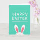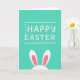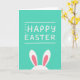 This design shows a teal background that feels fresh and springlike, with “HAPPY EASTER” centered in large, rounded white letters for easy reading 🌷. Thin white horizontal lines sit near the text, and three short white dashes appear to the left of the word “HAPPY,” adding a small, friendly accent. From the bottom edge, a long-eared bunny peeks up as if leaning in for a sweet hello 🐰. Only the top of its head and ears are visible, creating a shy, affectionate moment like a quiet nudge between friends. The ears are bright white with soft pink inner sections, giving a gentle contrast against the teal. The layout stays simple with lots of open space, keeping attention on the message and the bunny’s tender peek. The bunny’s symmetrical ears rise from the lower border, with blush-pink centers framed by crisp white outlines.