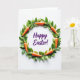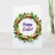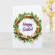 This design shows a spring flat-lay arrangement where rich purple lettering in the center reads “Happy Easter!” with the words set in a flowing, cursive style. Around the text, eight evenly sized orange root vegetables form a neat ring, each one angled outward like petals, suggesting a circle of friends gathered close. Their feathery light-green tops lean and overlap in places, creating small, tender touches where the greens meet, like a gentle nudge between companions 🐰. Between the vegetables, clusters of glossy deep-green leaves fill the gaps, adding darker accents that make the orange tones stand out 🌷. The message sits centered and unobstructed, with the purple text clearly separated from the greenery by a bit of open white space. Everything rests on a bright white background, and the even lighting creates soft, short shadows under the vegetables and leaves. The final detail is the subtle sheen on the emerald leaves as they curve around the circular wreath shape.