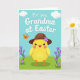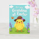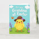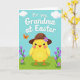 Designed with a sunny spring scene, the card features a plump yellow chick-like bird with large dark eyes and rosy cheeks, gazing forward with a sweet, affectionate look. It wears a brown brimmed hat, and a small purple flower sits near the right side of its face like a gentle accent. The background is sky blue with soft, cloud-shaped patches that keep the mood light and airy. Along the bottom, green grass stretches across the foreground, with slim stems of purple bell-shaped blooms rising on both sides like a friendly frame 🌷. In the upper left, a small orange butterfly drifts in, adding a quiet moment of companionship to the open sky. Near the top, white lettering is set above the character, centered and easy to read against the blue. The rounded shapes and smooth color shading give everything a tender, cozy look, while the purple flowers and butterfly add small touches of movement 🐇. The purple blossoms lean inward from the grass, with the butterfly hovering just left of the hat brim.