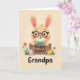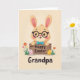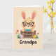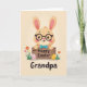This card features a cheerful, humanlike rabbit centered on a soft creamy background, wearing round glasses, rosy cheeks, and a neat blue bowtie for a friendly, affectionate look 🐰. The rabbit’s gentle expression and relaxed posture suggest a caring bond, like a warm greeting shared between close family or friends. It holds a rustic wooden sign across the upper-middle area with the words “Happy Easter” in dark lettering that stands out clearly. Around the sign, spring details add charm, including two decorated eggs—one with pink stripes and green dots, and another in golden yellow with fine parallel lines. Bright flowers and fresh green grass frame the lower area, giving the scene a cozy outdoor feel 🌷. Near the bottom center, the word “Grandpa” appears in rounded lettering, placed as a clear dedication beneath the main illustration. Soft, even lighting keeps the pastel colors gentle, with the eggs and flowers providing the strongest pops of color against the creamy backdrop. The wooden sign sits just above the rabbit’s paws, with the eggs tucked to either side among the flowers and grass.