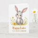 This greeting card features a sweet grey bunny sitting front-facing on a pale green wash of ground, surrounded by a few delicate yellow flowers on thin green stems 🌷. Its large dark eyes, long lashes, and rosy cheeks give it a tender, affectionate look, like it’s waiting for a hug from someone close 🐰. The bunny’s long ears stand upright with soft pink inner shading that matches its tiny pink nose. A small open mouth shows a hint of tongue, adding a gentle, friendly expression. Behind its left side, a fluffy round white tail peeks out against the light background. The background stays mostly white with soft, watercolor-like textures and no harsh shadows, keeping the focus on the bunny and flowers. Beneath the illustration, “Happy Easter” appears in orange lettering, with “TO A SPECIAL GRANDSON” printed below in smaller warm brown text. The yellow blossoms sit lightly across the lower scene, while the bunny’s ears reach upward into the open white space.