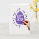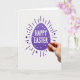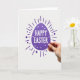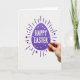 This card shows a rich purple egg-shaped cutout held gently by a human hand on the right, as if offering it to someone close 🐰. Centered on the egg, the words “HAPPY EASTER” appear in white, simple lettering that stands out sharply against the purple. Small white dots scatter across the egg like confetti, adding a light, flirty touch to the design. Around the egg, thin purple rays burst outward in different lengths, with a few tiny star-like marks that feel like a shared spark between friends. The background stays a pale gray, giving the scene plenty of open space and keeping the focus on the message and the hand’s careful hold 🌷. The lighting looks soft and even, so the edges of the egg and the printed text appear crisp without harsh shadows. The purple rays and tiny star accents radiate from behind the egg in a loose circle, all in matching purple tones.