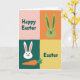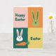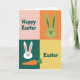 This design shows a spring-themed layout arranged in a neat 2x2 grid, with panels in blush pink, tangerine orange, deep teal, and lemon yellow. In the top-left pink square, dark green text reads “Happy Easter,” centered and easy to spot. The top-right orange panel features a simple green bunny head with long ears and a gentle, friendly expression 🐰. In the bottom-left teal square, a white bunny head with soft pink inner ears sits above an orange carrot with leafy green tops, like a small gift offered with quiet affection 🐇. The bottom-right yellow panel carries the word “Easter” in matching green text, placed neatly to balance the design. The colors stay flat and smooth, letting the shapes and lettering feel crisp and modern. Across the four squares, the bunnies’ rounded faces, upright ears, and the bright carrot stand out against the solid color backgrounds 🌷.