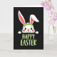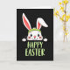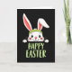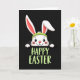 This card features a white rabbit shown from the chest up, peeking over the lower edge as if leaning in to greet someone 🐰. Set against a solid black background, its big dark eyes and rosy cheeks pair with a wide smile that feels like a friendly, affectionate hello. A bright lime-green headband sits across its head, and one long ear stands tall while the other bends slightly, adding a gentle, bashful look. Soft pink fills the inner ears, giving the face a warm contrast against the dark setting. Below the rabbit, the words “HAPPY EASTER” appear centered near the bottom in thick, brush-like uppercase letters, colored the same lime green as the headband 🌷. The matching green ties the accessory and the text together so your attention moves naturally from the rabbit’s face down to the greeting. Small rounded paws rest along the lower edge, as though the rabbit is holding on while it peeks out from the darkness.
