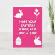 This design shows a strong fuchsia background that feels lively, with a bright white message centered and easy to read: “HOPE YOUR EASTER IS A HOP, SKIP AND A JUMP.” The letters use a simple, modern style and sit in the middle of the card, creating a confident focal point. A soft gray shadow behind each letter adds a slight lifted look without making the layout feel heavy. In the upper left corner, a small white rabbit silhouette 🐇 leans forward as if mid-hop, adding a friendly, upbeat touch. In the lower right corner, a second rabbit mirrors the motion, like a sweet companion in a shared dash across the page 🐰. A small white flower with rounded petals rests in the upper right, balancing the layout with a gentle spring accent. In the lower left, a white egg shape is decorated with simple patterned lines and shapes that stand out crisply against the pink field.
