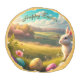A picturesque spring landscape with rolling hills and blossoming trees stretches out in an idyllic, sunlit valley. A bright white Easter bunny sits attentively in the grass, surrounded by colorful, artfully decorated Easter eggs. The flowers in vibrant colors and the warm golden light of the setting sun lend the scene a peaceful and festive atmosphere. The elegant lettering "Happy Easter" hovers above the scene, underlining the festive mood.