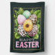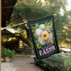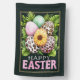 A bold, fashion‑forward Easter flag featuring a cluster of patterned eggs surrounded by soft greenery. Leopard prints, feather‑textured pastels, and a sunflower‑centered egg create a trendy boutique look against a dark background with a gold border. “Happy Easter” stands out in playful lettering, making this a perfect choice for anyone who loves stylish, modern holiday décor.