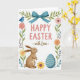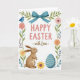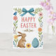 This card features a bright white background with the words “HAPPY EASTER” centered in soft pink, and “with Love” placed just beneath it in the same gentle tone. A symmetrical frame of green leafy vines curls around the message, dotted with small flowers in pale pink, yellow, and orange, plus a few tiny blue accents that add a sweet spring touch 🌷. At the top of the leafy arch sits a teal-blue bow, neatly tied like a little gift above the greeting. On the left, a light brown hare with long ears and a rosy nose stands upright, its calm gaze angled toward the center as if drawn in by the affectionate words 🐇. In the upper left, a small blue bird rests on a pink blossom, leaning in like a quiet companion to the scene. On the lower right, a light blue egg-shaped oval sits close to the border, decorated with wavy white stripes. The vines form an even, ornate loop around the text, with the teal bow centered above and the striped blue oval balancing the hare across the bottom.