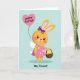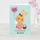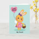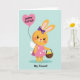 This card features a friendly, human-like bunny 🐰 facing forward on a light blue background, with long ears and warm orange fur that softens the scene. It wears a pink dress covered in small polka dots and a purple bow, adding a sweet, dressy touch. The bunny’s wide dark eyes, gentle lashes, and rosy cheeks create an affectionate look, like it’s greeting a close friend. In one paw, it holds a brown woven basket filled with shiny yellow egg shapes, suggesting a seasonal treat. Above the bunny, a pink heart-shaped balloon floats with “HAPPY EASTER” written across it in clear, easy-to-read letters. Near the bottom, the words “My Friend!” appear as a simple line of text, placed low and centered against the blue. Soft pastel tones—blue, pink, purple, and orange—keep the scene light and springlike 🌷. The balloon is heart-shaped and pink, with the text sitting neatly in the middle.