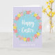 This card features a calm light blue circle at the center, surrounded by a ring of pastel flowers that feels like a springtime embrace 🌷. Inside the circle, “Happy Easter” sits prominently in a flowing cursive style, written in a darker blue that stands out clearly. Around it, pink, yellow, and sky-blue blossoms mingle with fresh green leaves, arranged like a thoughtful bouquet meant for a close pair. Tucked between the petals are striped oval egg shapes that add a festive touch without crowding the design 🐰. Small hearts and tiny star-like dots float near the circle, hinting at a sweet bond and shared affection. The background is a muted lavender tone that softly contrasts with the center and keeps the layout gentle on the eyes. Beneath the main greeting, “Nephew & Wife” appears in a simple, neat font in a darker shade, centered under the circle. The floral wreath includes mixed petal shapes, scattered greenery, and a few striped eggs nestled evenly around the border.