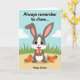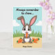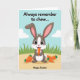 This card features a brown-and-white long-eared bunny 🐰 sitting in the lower half of the scene, with wide eyes and soft pink blush on its cheeks that gives it a sweet, friendly look. The bunny holds an orange carrot up to its mouth as if sharing a quiet snack, and the gentle curve of its gaze feels like it’s meant for someone close by. A few more plump carrots rest on the sandy ground near its feet, adding a casual, cozy touch to the setting. Above, a light blue sky stretches across the top with small white clouds drifting by, while a band of green grass runs along the horizon like a simple spring backdrop 🌷. Near the upper area, the phrase “Always remember to chew...” appears in a dark, easy-to-read style, floating over the sky without crowding the artwork. Along the bottom, “Happy Easter” is set in orange lettering that echoes the carrots and frames the bunny like a warm sign-off. The scene is drawn with smooth outlines and soft, sunny colors, with the orange carrots bright against the pale sand and blue sky.