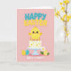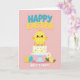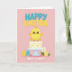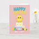 This greeting card features a soft pastel illustration that leans into springtime charm with a gentle, affectionate tone 🌷. In the center, a round yellow chick with rosy cheeks and wide eyes stands atop a smooth white cake, its slightly tilted head giving it a sweet, friendly presence. The cake shows small yellow flower decorations with a few light gray accents and sits on a pale blue pedestal stand, with five golden candles glowing at the top. Across the upper area, the words “HAPPY EASTER” appear in thick, dimensional letters, mixing teal with sunny yellow for a cheerful contrast. Beneath the cake, “NIECE’S FIRST!” is written in small, soft white lettering, placed low and centered, like a quiet note of affection from the sender 🐰. Near the base, patterned eggs in yellow and turquoise sit on either side, adding a cozy, shared-celebration feel to the scene. A white daisy with a golden center and green leaves rests beside the eggs, all set against a blush pink background.