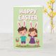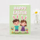This design shows two young figures, a boy and a girl with simple, friendly faces and wide smiles, standing close and holding hands in a way that suggests an easy friendship. Each wears tall white bunny-ear headbands with soft pink inner details 🐰, adding a gentle holiday touch. They carry small woven baskets filled with patterned oval eggs in assorted colors, as if they’ve just finished a sweet springtime hunt together. The background is a pale green field that feels like early-season foliage, keeping the scene light and airy. Along the bottom, a strip of green grass is dotted with small pink and orange flowers 🌷, plus a few larger decorated eggs in gold and magenta tones. Near the top, the words “HAPPY EASTER” sit in large white letters with a bright pink outline, centered above the pair. The illustration uses crisp outlines and a soft, cheerful palette that keeps the focus on their tender, side-by-side pose. A few oversized decorated eggs rest among the grass and blossoms at their feet.