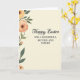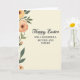 This card features a soft cream background that gives the whole design a gentle, welcoming glow 🌷. Centered near the top, the words “Happy Easter” appear in a flowing, cursive-style lettering in a warm, medium-toned color. Just below, “FOR A WONDERFUL MOTHER AND FATHER” is set in uppercase serif letters, smaller and neatly spaced, creating a steady, devoted tone. Along the left edge, a tall column of stylized spring flowers and buds leans upward like a thoughtful bouquet offered with care 🐇. The blossoms are shaded in apricot and peach, with a few deeper accents that make the petals look softly layered. Slender, deep green leaves weave between the blooms, guiding the eye toward the centered greeting as if the flowers are framing it for someone cherished. The left border shows peach blossoms with subtle shading, paired with elongated green leaves against the cream backdrop.