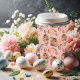 Tan Easter bunnies sitting inside a floral Easter egg with white, purple, and pink eggs with flowers on a light pink watercolor background. Greet your guests to your Easter Sunday brunch or luncheon, because we have a matching tableware set. Cute for family and children alike.