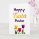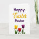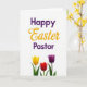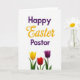 This card features a white background with a large greeting centered near the top, mixing two font styles for contrast. The word “Happy” appears in deep purple, and “Pastor” is also set in deep purple, both in a sturdy, simple sans‑serif style. “Easter” sits alongside in golden yellow with smooth, flowing letterforms, adding a warm, friendly touch 🌷. The layout leaves plenty of open space, so the message feels direct while still gentle and inviting. Below the text, three cup-shaped spring flowers lean in a soft curve as if keeping close company like friends. One bloom is bright yellow, one is red, and one is purple, each on slim green stems with a few leafy accents, with a small 🐰 tucked near the floral cluster. The flowers stretch across the lower portion of the design, their saturated petals standing out sharply against the plain white field.