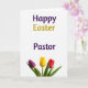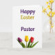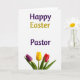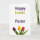 On the front of the card a bright Easter greeting sits centered on a white background, with “Happy” in deep violet and “Easter” in golden yellow, creating a cheerful contrast 🌷. Just below, the word “Pastor” appears in the same violet, smaller and neatly aligned under the main message. The generous spacing and tidy centering give the layout an easy, respectful look, like a friendly note meant for someone you truly value. At the bottom edge, three tulips rest close together as if leaning in like companions, adding a gentle touch of friendship to the scene 🐰. The blooms move left to right in deep purple, golden yellow, and rich red, tying back to the colors in the text above. Soft, even lighting shows the petal texture without harsh shadows, keeping the white background smooth and calm. Slender green stems and wide green leaves fan outward beneath the three tulip heads at the base.