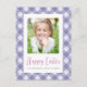 This cute Easter postcard features a lavender buffalo check pattern with a photo and Happy Easter in a beautiful script. The back of the postcard includes a message for personalizing and watercolor spring florals.