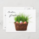 Happy Easter design is showing a basket full of eggs and grass. The image is available for a variety of products. Text adding is optional.