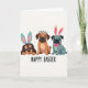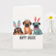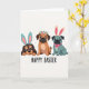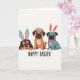 This card shows three stylized puppy-like companions arranged in a neat row on a white background, with their bodies angled slightly toward one another as if sharing a friendly moment 🌷. On the left, a chocolate-brown and tan pup peeks forward with wide, curious eyes and oversized teal-and-pink ears that look like a costume headband. In the center, a fawn-colored pup sits upright, wearing a small crown of pink and blue blossoms, and its calm gaze feels like a gentle nod to the others. On the right, a bluish-gray pup with a compact shape wears soft pink ears and a bright fuchsia bow at the collar, adding a flirty touch 🐰. The trio’s close spacing and matching pastel accents make them feel like a little group posing for a springtime photo. Below the characters, the words “HAPPY EASTER” appear centered in clear, easy-to-read uppercase lettering in a dark tone that stands out against the white space. Light pastel shades dominate the scene, with brighter pops in the ears, flowers, and bow drawing the eye across the lineup. The central pup’s flower crown shows tiny rounded petals in pale pink and baby blue.