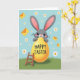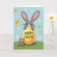 Designed with a stylized grey rabbit peeking from behind an oversized golden egg, the scene shows pink inner ears, wide dark eyes, a tiny red nose, and lightly rosy cheeks that give the bunny a tender, friendly look 🐰. Thin whiskers curve outward as if the rabbit is leaning in close, like it’s sharing a small secret with someone just off to the side. Centered on the egg, the words “HAPPY EASTER” sit prominently across the front in bold lettering, standing out against the warm yellow surface. Behind them, a calm blue sky stretches across the background, sprinkled with white daisies whose sunny centers echo the egg’s glow 🌷. Small orange-yellow envelopes drift among the flowers, adding a gentle sense of exchange, like notes being passed between friends. Along the bottom, layered green grass forms a soft base with simple, stylized blades that guide the eye back up toward the main focal point. A small wooden ladder rests against the lower edge of the egg, angled slightly as if someone just climbed up to place the message.