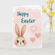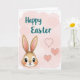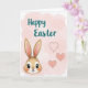 This card features a friendly rabbit headshot 🐰 with long ears in warm brown tones and soft pink inner ear details, set against a light pink watercolor-style background. The rabbit’s dark, wide eyes and gentle lashes meet the viewer with a tender, welcoming look, and its rosy cheeks suggest a sweet, affectionate mood. A small, calm smile gives the character an easy warmth that feels like a quiet hug between friends. Across the top, the words “Happy Easter” curve in a teal, flowing font, standing out clearly against the pale backdrop. The lettering sits centered above the rabbit’s ears, leaving airy space around the face so the expression stays the focus. To the right side, three small hearts add a touch of romance—two lightly filled in pale pink and one left as an outline 🌷. The background remains softly mottled, like diluted paint, with the hearts hovering near the rabbit’s cheek area on the right.
