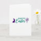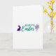 This design shows a mostly white front with a wide open background that keeps all attention on the centered greeting. The layout runs horizontally, balancing two words with small icons on either side for a calm, friendly look. “HAPPY” sits first in a simple sans‑serif style, colored medium teal, like a cheerful hello between close friends. Just below and slightly to the right, “Easter” appears in a flowing cursive style in the same teal, adding a softer, more romantic touch. A deep purple rabbit silhouette stands to the left with ears up, as if leaning in with gentle curiosity 🐇. On the right, a deep purple six‑petaled flower adds a sweet spring note 🌷. The teal lettering and purple shapes stay solid and untextured, keeping the look neat and modern. The rabbit and flower flank the teal words across the bright white space.