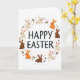 This design shows a digital illustration with large black “HAPPY EASTER” lettering centered as the main focus. A circular wreath of stylized rabbits surrounds the text, arranged so they seem to lean toward one another with tender, friendly expressions 🐰. The rabbits are colored in soft cream, warm orange, and deep chocolate brown, with rounded shapes and smooth outlines that keep the scene easy on the eyes. Between them, earthy leaves and small round dots in muted orange and deep red fill the ring, adding gentle contrast without feeling busy. The background stays bright white, letting the warm tones stand out while keeping the overall look light and springlike 🌷. The words sit in the middle of the circle, evenly spaced, with the black text clearly separated from the surrounding shapes. One pale rabbit includes a small magenta tail detail near the lower part of the wreath.