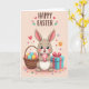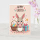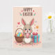 This greeting card shows a cute, stylized bunny with big shining eyes and softly rosy cheeks, holding a polka-dotted egg close as if it’s a small gift for someone special 🐰. To one side sits a woven basket filled with smooth, colorful eggs, and nearby there’s a teal present topped with a large pink bow that feels like a friendly gesture waiting to be shared. The background is a warm, muted beige, keeping the scene gentle and calm while letting the colors stand out. Small hearts and simple flower shapes drift around the bunny, adding a sweet, affectionate tone like a quiet nod between close friends 🌷. Soft, diffused lighting gives the bunny and objects rounded highlights, making them look slightly raised from the surface. The words “HAPPY EASTER” appear across the top in a casual hand-drawn style, set in a darker shade that contrasts clearly against the beige. Fine details show in the basket’s woven texture, the eggs’ glossy finish, and the neatly looped ribbon tails on the pink bow. Tiny heart icons and flower silhouettes are scattered around the bunny, basket, and gift against the beige background.