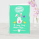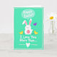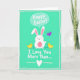 The front design shows a stylized white rabbit with long upright ears and a soft pink belly, standing between two plump yellow birds that lean in as if sharing a friendly secret 🐰. A small violet butterfly hovers above them, adding a light touch of motion against a mint green background. Near the top, “Happy Easter!” appears inside a cloud-shaped speech bubble, set in dark lettering that stands out clearly. Along the lower area, the phrase “I Love You More Than...” is written in white lettering, arranged in a gentle curve that leads the eye toward the ending. The line finishes with a white heart, and the closeness of the animals makes the message feel like a quiet, affectionate exchange 🐇. A white scalloped border frames the scene with a faint texture, giving the edges a soft, decorative finish. Beneath the trio, a few short dark green strokes suggest little tufts of grass on the ground.