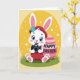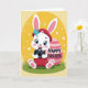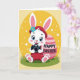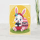 This card shows a white cartoon rabbit with bright blue eyes and rosy cheeks, sitting calmly with a friendly, affectionate look that feels like it’s meant for someone special 🐰. The rabbit wears red overalls and a matching beret, topped with a small blue flower that adds a sweet spring touch 🌷. In its paws, it holds a small black camera, as if it’s ready to capture a shared moment with a close friend. To the rabbit’s right stands a tall, striped oval egg shape, decorated like a festive display piece. The words “HAPPY EASTER” appear centered on the egg in black letters, standing out clearly against the lighter stripes. A patch of green grass anchors the bottom of the scene, while the background is a sunny yellow sprinkled with small white stars and dots. Soft pink tones show in the rabbit’s ears and paws, and the red, blue, green, and yellow colors sit in neat, tidy shapes across the design. The egg’s stripes alternate light tones, with the black “HAPPY EASTER” text placed squarely in the middle.