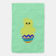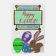 Happy Easter is written in red script inside colorful frame with the wording, Easter Egg Hunt, Bunny Rabbit, Fun. Cute brown bunny rabbit with green, blue, purple decorated eggs on front. A cute and spunky yellow chick hatched from its colorful striped egg is on the backside against solid fresh green background. Original Artwork design © TamiraZDesigns.