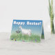 Easter Card for Saanen Goat lovers- This pretty Saanen is bringing you an Easter basket in her mouth standing in the green grass with colored Easter eggs scattered around the grass. On the inside she left her Easter basket for you in the grass. Happy Easter written in clouds in the blue sky. Goat Easter Cards for anyone who raises or just loves goats.