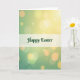 This design shows a dreamy spring gradient shifting from earthy green at the bottom to sunny yellow near the top, with soft glowing circles drifting across like distant lights 🌷. The floating orbs in pale gold, warm amber, and misty white add a gentle sparkle that feels like two friends sharing a quiet laugh under fresh leaves. A wide, horizontal ivory band runs through the center, creating a calm stage for the greeting. Centered on that band, the words “Happy Easter” appear in flowing cursive-style lettering in deep forest green, standing out clearly against the light strip. The smooth curves of the letters give the message a tender, affectionate tone, like a note passed between close companions 🐰. The surrounding glow and layered light spots frame the text without crowding it, keeping the focus on the middle. Small, softly blurred circles overlap the green-to-yellow background behind the band, with the brightest highlights gathering near the upper right.