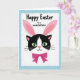 This card features a stylized cat face in a tuxedo-like black-and-white pattern, centered within a white rectangular panel that has a lightly textured, torn-paper edge against a soft sky-blue background. The cat’s large green eyes look upward with a gentle, curious gaze, and a small heart-shaped pink nose sits above fine black whiskers that sweep outward like a shy smile. Two tall pink bunny ears rise from the top of its head, giving the scene an Easter twist 🐰. A bright pink bow rests under the chin, adding a sweet, friendship-like touch, as if the character dressed up just to be noticed. Near the top of the white panel, the words “Happy Easter” appear in thick, friendly lettering, with “to a wonderful Sister” placed beneath in a thinner, flowing style. The text is set in a dark tone that stands out clearly against the white panel, keeping the layout easy to read. The overall palette stays calm and spring-ready, balancing the black-and-white face with lively pink accents and those glossy green eyes 🌷. The white panel sits neatly centered on the blue field, with the torn edge visible all around and the bunny ears extending into the open space above.