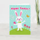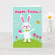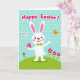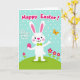 This card shows an adorable white bunny standing on a rich green hill, holding a pink polka-dotted egg close like a sweet gift for someone special 🐰. The bunny’s long ears are lined in soft pink, with a little fuchsia nose and rosy cheeks that give it a tender, friendly look. A bright green bow tie adds a dressed-up touch, as if the bunny is ready for a gentle springtime visit. Behind it, a pastel blue sky is sprinkled with small white circles that feel like soft light drifting across the background. Near the upper right, a small orange butterfly floats by, adding a hint of motion and a quiet, shared moment in the scene 🐇. At the top, “Happy Easter!” appears in large fuchsia letters, and just below it “To a Special Girl” is written in teal, set in a flowing style. Pink flowers with yellow centers peek up from the grass around the bunny, framing the hill with simple spring color. The egg is an oval in bright pink with evenly spaced white dots, held in the bunny’s paw at the center of the design.