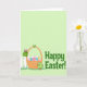 This card shows a spring scene with a woven basket near the bottom, filled with pastel eggs decorated with tiny patterns and little flower accents in pink and blue 🌷. A small round yellow-green chick with bright orange feet stands close to the basket, its wide eyes turned toward the display as if keeping it company like a close friend. Behind them, a white picket fence peeks up from tufts of green grass, giving the setting a cozy backyard feel. A green tag tied to the basket handle with a pink ribbon hangs forward, adding a sweet touch like a note left for someone special. The tag reads “Spring is in the Arr” in dark lettering, placed near the center-left area of the design. On the right side, large green text says “Happy Easter!” with an exclamation point, standing out against the light spring-green background 🐰. Several eggs show tiny cherry-blossom-like flowers, with small petals clustered near their tops.