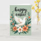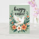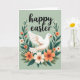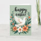 This greeting card features a white bird with wings gently spread, shaded softly to suggest a calm glide through spring air. A full green wreath of leaves and stems circles the bird, with peachy-orange and creamy off-white blossoms tucked in like little gifts 🌷. The flowers show dark centers and fine details, and the way the petals lean toward one another feels like a tender, friendly closeness. Above the wreath, the words “happy easter” sit near the top in black lettering that curves smoothly across the space 🐇. The background is a muted sage green, giving the scene a quiet, romantic calm without stealing attention from the central figure. Smaller white florets dot the greenery, adding light touches that feel like gentle glances exchanged around the wreath. The bird’s bright white body stands out crisply against the soft green, while the leaves range from deep green to lighter tones for depth. The text is centered above the wreath, and the blossoms cluster most densely along the lower half of the circular frame.
