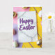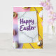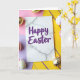 This design shows a white greeting card with faint gray marble-like lines, photographed from above on a spring-toned background. Centered on the card, the words “Happy Easter” appear in purple lettering, standing out against the pale surface. The card rests over large color sections of blush pink, soft lavender, and sunny yellow, with thin deep-purple strokes cutting across them like quick paint marks. Around the card, egg-shaped decorations are scattered as if just placed by two friends decorating together, close enough to overlap and create a cozy, shared moment 🐰. Some of the eggs shine in metallic gold with small white dots, while others look like rose-gold with the same dotted pattern. A few eggs are white with bright pink and yellow spots, adding little bursts of color near the corners 🌷. The lighting is bright and even, and the purple strokes run diagonally between the pastel sections behind the card.