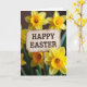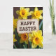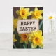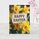 This design shows a rustic rectangular sign with softly scalloped edges resting among spring flowers, like it’s been placed there with care by a close friend. Centered on the sign, the words “HAPPY EASTER” sit in dark brown, thick lettering against a warm cream background. A weathered, sepia-toned border frames the message and adds a cozy, timeworn look. Around it, clusters of bright yellow daffodil-like blooms 🌷 lean inward, their trumpet centers shaded with deeper orange ruffles that feel like little nods of affection. Deep green leaves fill the gaps, creating a natural backdrop that makes the yellow petals stand out. Gentle, diffused light softens the scene, and a few flowers appear slightly out of focus, as if they’re quietly keeping the sign company 🐰. The sign sits in the mid-ground, with crisp petals in front and a warm brown background fading softly behind.
