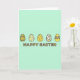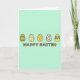 This design shows a soft pastel mint-green background with five egg-shaped decorations lined up across the center, each filled with sunny yellow and edged in thin black lines. From left to right, the first egg has neat horizontal stripes, the second shows a light blue-and-white grid, and the middle egg is dotted with mixed-size spots that feel like a friendly wink 🐰. The fourth egg carries small white and yellow circles scattered like confetti, while the last one has sharp white-and-black zigzags that add a little spark beside the calmer patterns. The eggs sit close enough to read as a little group, like friends leaning in for a photo 🐇. Below them, the words “HAPPY EASTER” appear centered in chunky yellow letters outlined in black. The yellow shapes pop against the mint background, with white and light blue details keeping the look airy. The zigzag egg on the far right has alternating white and black chevrons over the yellow fill.