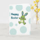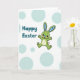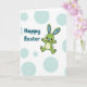 This card shows a green, rabbit-like character springing up on the right side, as if leaping toward someone just out of view with an open-armed, friendly eagerness 🐰. Its long ears stand tall, with a blue-and-white check pattern inside that adds a sweet, cozy touch, and a small fluffy white tail peeks out behind. The face has big dark eyes, lightly rosy cheeks, a tiny blue nose, and a wide smile with a hint of pink tongue, giving it a tender, welcoming look like it’s greeting a close friend. On the left, the words “Happy Easter” sit prominently in rounded deep teal letters, balancing the character across the page. The text is placed in the upper-left area with plenty of open space around it, so it reads clearly without crowding the artwork. The background stays bright white, sprinkled with soft pale blue-green circles in different sizes that drift like gentle confetti or spring buds 🌷. The right side feels more animated with the jumping figure, while the left side stays calmer with the lettering and floating dots. The inner ears show a neat blue-and-white checker pattern, and scattered pale blue-green circles float across the white backdrop.