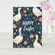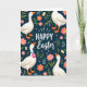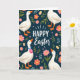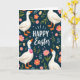 This design shows four white, duck-like birds with orange beaks and webbed feet arranged around a central greeting, their calm poses suggesting a friendly closeness as they face inward. The background is a deep navy blue that makes the lighter figures and spring details stand out. In the middle, “HAPPY” appears in large uppercase lettering, with “Easter” placed just below in a flowing cursive style, both set in a light color for strong contrast. Around the birds, soft pink and coral flowers mingle with green and bluish leaves, creating a garden-like setting that feels gently romantic in its quiet symmetry 🌷. Several pastel oval shapes with small patterns are tucked among the plants, like little finds hidden in the foliage 🐇. One bird wears a striped pink oval pendant hanging from a bright blue ribbon, adding a sweet, affectionate touch to the group. Small blossoms and leaves scatter across the navy background, with the patterned ovals nestled between petals and stems.