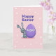 The front design shows a vertical layout on a soft blush-pink background sprinkled with small white polka dots, giving the scene a light, airy feel 🌷. In the center, a stylized gray rabbit with long ears and wide eyes smiles with two tiny front teeth showing. The rabbit wraps its arms around a large purple egg, holding it close the way a friend might pull someone into a gentle, grateful hug 🐰. Soft shading along the rabbit’s fur and the egg’s curved surface adds depth, with a slight shine that catches the light. Across the middle of the egg, the word “TEACHER” appears in white capital letters, standing out clearly against the purple. Near the top, “Happy Easter” is placed above the rabbit in a deeper lavender tone, centered and easy to read. The rabbit’s cheeks carry a rosy blush, and a small fluffy white tail peeks out near the lower edge of its body.