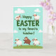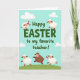 Made to share a spring holiday scene set against a pale blue sky, where five cartoon sheep with soft, fluffy coats and gentle faces gather around a friendly message. In the center, the words “Happy EASTER to my favorite teacher!” sit large and easy to read in rich green lettering. One sheep springs near the top left as if showing off for a friend, while another perches on a letter at the upper right with a fond, steady gaze. Along the bottom, three more sheep romp across a rolling green hill, including one in a warm brown tone beside two white companions, leaning close like a small group of pals. Four rounded white clouds float across the background, keeping the scene airy and light. Tiny flower shapes dot the foreground like early blooms 🌷, adding a gentle seasonal touch alongside the cheerful animals 🐰. The green hill curves along the lower edge with small floral accents sprinkled near the grass line.