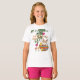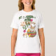 This is a cute custom T-shirt for a young girl for a Happy Easter Holiday featuring an Easter Bunny with chickens, in an eggshell, sitting under a tree, surrounded by flowers.