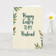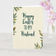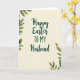 Designed with a rustic spring look, this card centers the words “Happy Easter TO MY Husband” in an elegant layout that feels close and affectionate 🌷. “Happy Easter” and “Husband” appear in dark emerald green, written in flowing lettering that gives the message a tender, romantic tone. “TO MY” sits between them in a simple, neat font, also in green, adding contrast and making the wording easy to read. Soft botanical accents frame the text, with leafy branches drifting down from the top-left and rising from the bottom-right like they’re gently reaching toward each other 🐰. The leaves are painted in muted greens from olive to deep forest, with a few earthy brown touches that suggest natural stems. Everything sits on a pale creamy off-white background with a subtle vertical wood-grain texture running behind the design. The top-left foliage is slightly fuller, while the bottom-right branch is slimmer and angled upward across the corner.