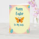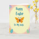 This card features a spring-themed illustration with “Happy Easter” centered near the top in flowing teal lettering, with “To My Wife” placed just beneath it in smaller teal text. Below the words, a large butterfly spreads wide wings in warm orange, and the fine line patterns and tiny glowing dots give it a tender, affectionate look, as if it’s hovering close for a gentle greeting. The butterfly’s body is deep black with curled antennae, adding contrast that draws your eye back to the middle. Behind it all, a soft radial gradient shifts from golden yellow at the center to peachy pink around the edges, like early morning light. In the corners, decorated egg shapes in pastel lavender, mint green, sunny yellow, and sky blue add a cozy seasonal touch 🌷. Each egg carries its own swirling pattern, creating the sense of careful attention and a quiet closeness 🐇. The orange butterfly sits centered over the warm yellow glow, while the pastel eggs frame the corners against the peach-pink edge.